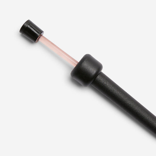 Retirez l\'embout à l’extrémité de la poignée. Pour déterminer la bonne longueur de corde, placez un pied au milieu de celle-ci et relevez les poignées vers le haut, le long du corps: les poignées doivent arriver au niveau de l\'épaule. Coupez le surplus de corde. Replacez l\'embout, et sautez!