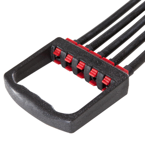 L\'expander est évolutif : vous pouvez choisir la résistance en fonction de votre niveau ou de l’exercice. Si vous débutez, les 5 élastiques risquent d’être trop difficiles à tirer pour réaliser une parfaite exécution de mouvement. Commencez par 1 ou 2 élastiques puis augmentez progressivement.