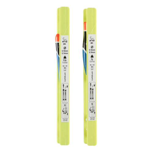 2 lignes montées de 3m avec un flotteur de 0,6g, un fil de 16/100, un bas de ligne de 14/100 et un hameçon numéro 12 sans ardillon avec un flotteur de 2g, un fil de 18/100, un bas de ligne de 16/100 et un hameçon numéro 10 sans ardillon Lignes montées avec de l\'étain (sans plombs) 1 lest en zamac pour prendre le fond 1 dégorgeoir jaune 4 hameçons montés sans ardillon 1 sac de transport 1 notice d\'utilisation