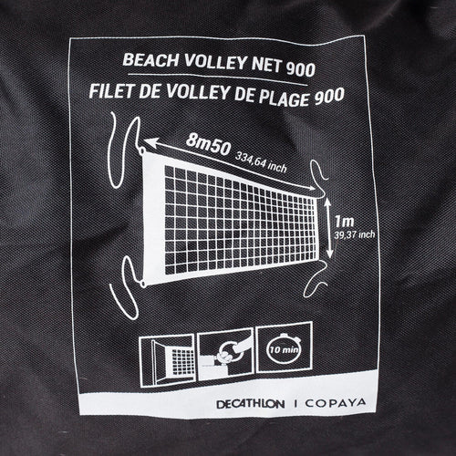 Ce produit n\'inclut pas les poteaux. Le filet est aux dimensions officielles (8,5 m x 1 m). Il peut être facilement installé entre 2 poteaux distants entre 9m et 12m maximum. Il s\'agit d\'un filet noué dont les mailles ont la dimension standard (10 cm x 10 cm). La bande supérieure et inférieure du filet font 80mm. Une fois replié, le sac de transport mesure 75 cm x 30 cm x 30 cm Poids de l\'ensemble : 2 kg