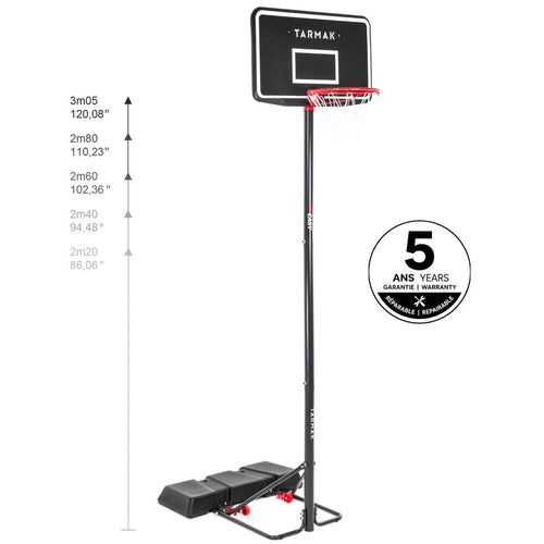 Panier de basket B100 noir adapté pour les enfants et les adultes pour jouer au basketball en extérieur. Se règle sans outils sur 5 hauteurs de 2,20m à 3,05m .