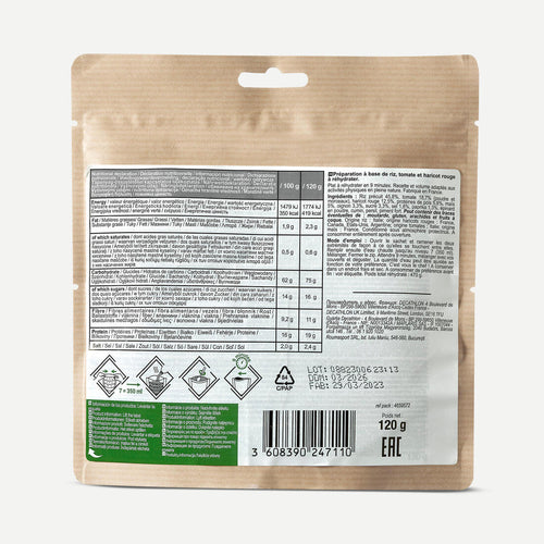 Cette portion de 120 g pour 1 personne vous apportera 419 kcal après 9 minutes de réhydratation avec de l'eau chaude. Son pack compact et léger se glisse facilement dans votre sac à dos.