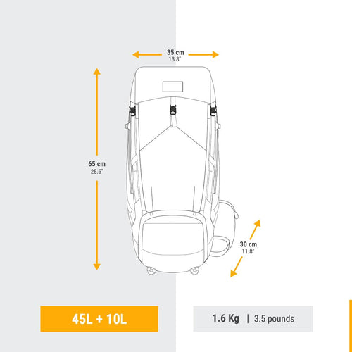 Le sac présente un volume de 45 L avec une réhausse permettant de contenir 10 L supplémentaires. Le volume de chaque sac à dos est mesuré selon une méthode standardisée. Nous utilisons des petites balles pour remplir le compartiment principal ainsi que chaque poche. Les balles sont ensuite vidées dans un container gradué, qui permet de déterminer le volume équivalent en litres, avec une tolérance de quelques %.