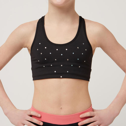 Notre brassière de gym permet d\'effectuer ses mouvements librement et d\'avoir moins chaud durant l\'entrainement. Quels sont les plus du produit ? - Sa coupe : col rond, pas de poitrine visible quand on se penche en avant, dos nageur pour dégager les épaules et favoriser les mouvements. - Longueur ajustée pour que la brassière reste toujours sous la poitrine, même les bras levés. - Doublure sur le devant pour éviter toute transparence. - Maintien poitrine modéré pour les tailles 12 et 14 ans.