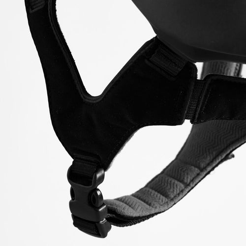 C\'était l\'un des défis de nos ingénieurs : vous offrir un casque résistant, solide, léger et hyper confortable. Pour y parvenir, l\'équipe Fouganza a travaillé sur l\'ergonomie de l\'attache, qui épouse la forme du visage du cavalier. En polyester, moelleuse et toute douce, elle lui offre un vrai confort ! Le bonnet, amovible, lavable et fixé au casque par un système de scratch, comporte de la mousse positionnée précisément pour réduire les points de pression sur votre tête.
