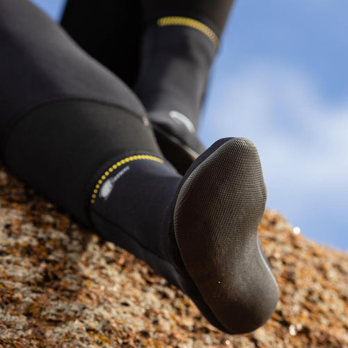 Néoprène 3 mm. Les coutures du chausson sont étanches, assemblées en GBS (Glued and Blind Stitched) : le néoprène est collé dans un premier temps, puis cousu pour une résistance maximale (l\'aiguille ne traverse pas complètement le néoprène pour éviter l\'infiltration d\'eau). Une zone d\'encre est imprimée sous la semelle afin d\'augmenter la résistance et l’adhérence du chausson.
