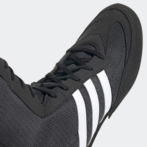 Sois intouchable. Cette chaussure de boxe adidas Box Hog te permettra de rester hors de portée de ton adversaire grâce à sa tige en mesh léger, sa semelle intermédiaire en EVA ultra fine et sa semelle extérieure en caoutchouc adhérent. La tige mi-montante et les renforts internes t\'assurent une stabilité supérieure quand ton jeu de jambes s\'intensifie.
