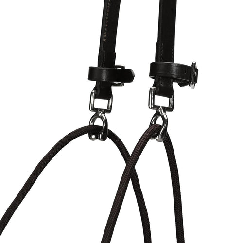 Fixe la tête du cheval, provoque l\'abaissement de l\'encolure et muscle le dos.