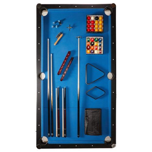 - 4 queues de billard : 2 queues 500 US (145 cm), 1 queue 300 US de 122 cm et une queue 300 US de 145 cm - 1 rallonge avec 1 bridge et 1 croix - 15 billes de billard américain numérotées de 57,2 mm de diamètre (162 g) + 1 bille blanche - 15 billes de billard anglais (rouges et jaunes) de 57,2 mm de diamètre (162 g) + 1 bille blanche - 1 triangle standard et 1 losange pour le jeu de la 9 - 1 porte queues - 4 craies (bleus) et 2 porte-craies - 1 brosse et 1 housse de protection