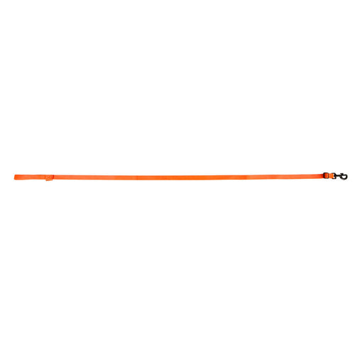 Cette laisse orange est résistante, ajustable et imputrescible.