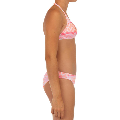 Ce maillot de bain 2 pièces foulard a été conçu pour s’adapter le mieux possible à la morphologie de la surfeuse grâce à un réglage tour de cou tout en assurant une bonne tenue dans les vagues.