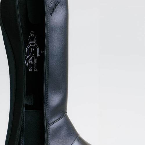 Ce modèle dispose d\'une coupe assez ajustée. Nous vous conseillons d\'opter pour la taille dans laquelle vous serez le plus à l\'aide, cela vous permettra de ne ressentir aucune gène à pied comme à cheval. Par exemple si j\'ai obtenu comme mesure 30 cm en tour de mollet et 36 cm en hauteur je devrais donc prendre le 10 ans. Cependant si vous hésitez entre le 10 ans et le 12 ans au vu de vos mesures, je vous conseille de prendre la taille du dessus afin de pouvoir les garder le plus longtemps !