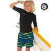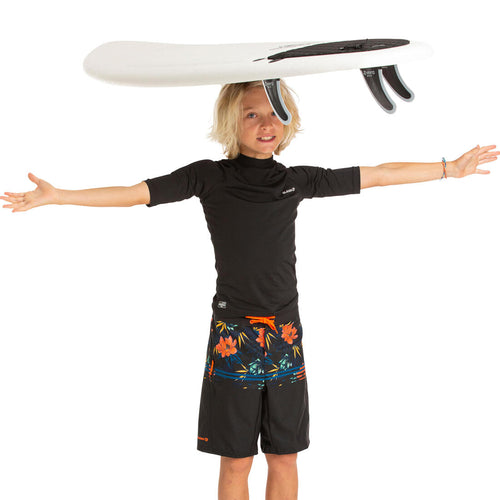 Tee shirt anti-UV enfant manches courtes pour protéger du soleil, même dans l'eau, et limiter les irritations au contact de la planche. Coupe ajustée pour une meilleure stabilité dans la vagues.