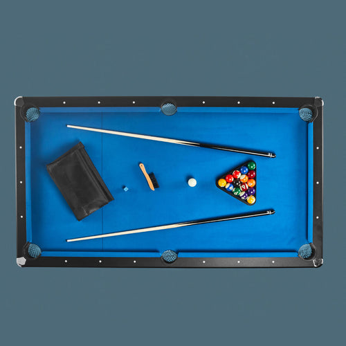 Avec ce kit, vous avez tout à portée de main pour progresser : - 2 queues de 145 cm (57\"\") avec procédé collé de 13 mm de diamètre et pèse 540 g (19 oz). - 15 billes de billard américain numérotées de 57,2 mm de diamètre (162g) + 1 bille blanche - 1 triangle et 1 brosse spéciale pour nettoyer le tapis. - 1 craie (le bleu) pour enduire l\'extrémité de vos queues de billard (qui s\'appelle le procédé). - 1 range bille et 1 marqueur de score. - 1 housse de protection contre les UV et la poussière.