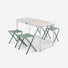 Cette table pliante de camping, 4 à 6 personnes, est conçue pour être compacte et solide. Elle est accompagnée de 4 tabourets pliants.