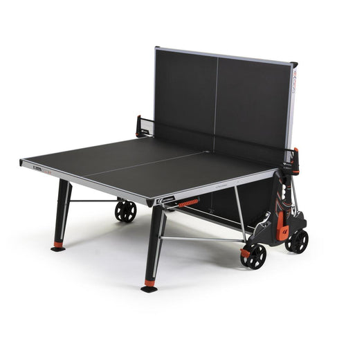 Très bonne mobilité grâce à ses grandes roues (diamètre 200 mm), même sur les sols irréguliers. Une roue double est plus résistante ; elle offre une meilleure stabilité à la table. Des emplacements ont été spécialement conçus sur les cotés de la table pour ranger quatre raquettes. Possibilité de jouer seul : Un plateau de la table peut être relevé afin de s’entrainer seul. Autres équipements : 2 compteurs de points et 2 vide-poches.