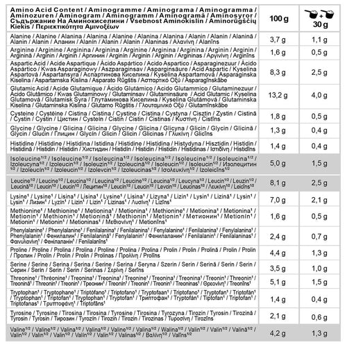 Tableau nutritionnel : POUR 100 g | PAR PORTION DE 30 g Energie: 366 kcal | 110 kcal Energie: 1560 Kj | 468 Kj Matières grasses: 2,5 g | 0,8 g dont acides gras saturés: 1,3g | 0,4 g Glucides: 18 g | 5,4 g dont sucres: 9,5 g | 2,9 g Fibres: 2 g | 0,6 g Protéines: 69 g | 21 g Sel: 1,2 g | 0,36 g